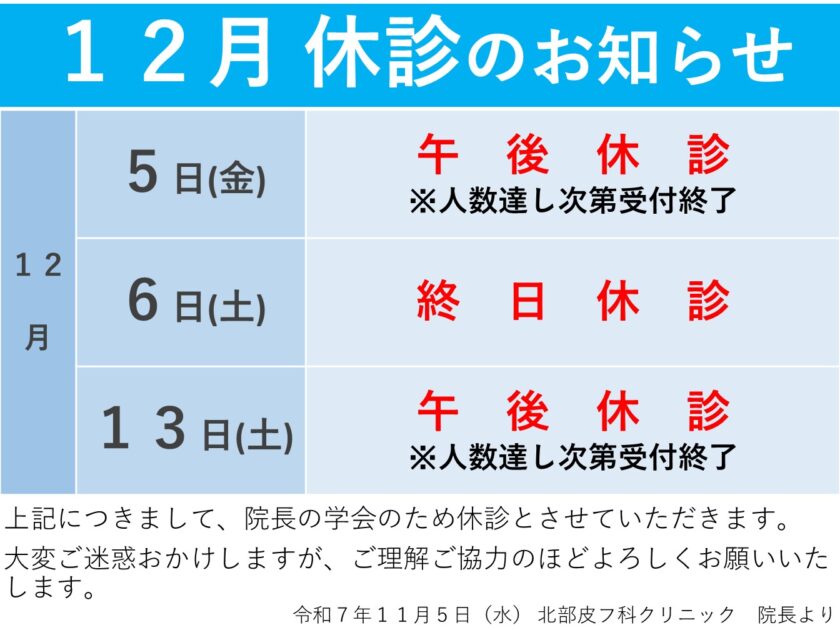 令和7年12月5日(金)午後休診 ・ 6日(土)終日休診 ・ 13日(土)午後休診のお知らせ