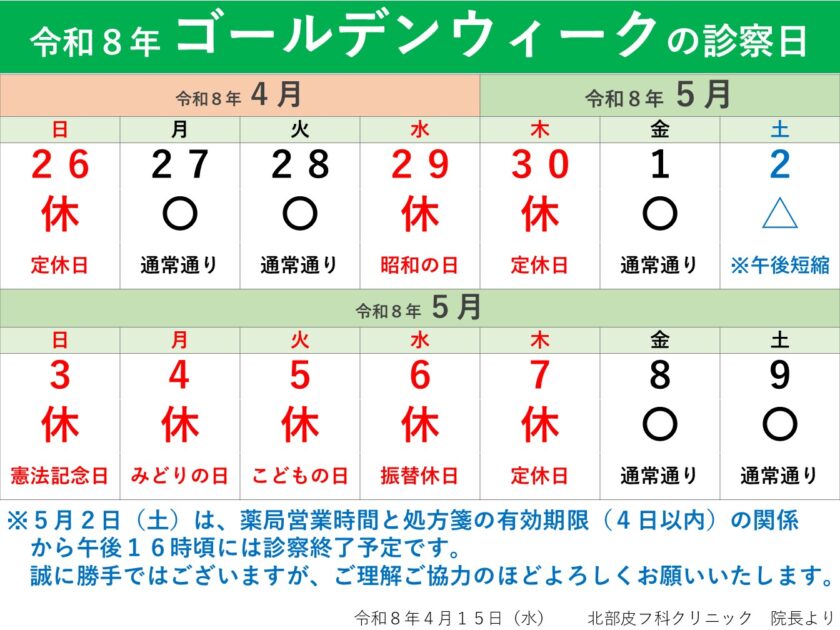 令和8年ゴールデンウィークの診療について ※5月2日(土)診療16時まで 投稿日:2026.04.18 令和8年ゴールデンウィークの診療について ※5月2日(土)診療16時まで いつもご利用ありがとうございます。 令和8年のゴールデンウィークの診療につきましては、下記表の通りとなります。 5月2日(土)に関しましては、処方箋の有効期限(4日以内)と薬局の営業時間の兼ね合いから午後16時頃には診察を終了する予定です。 誠に勝手ではございますが、ご理解・ご協力のほどよろしくお願いいたします。